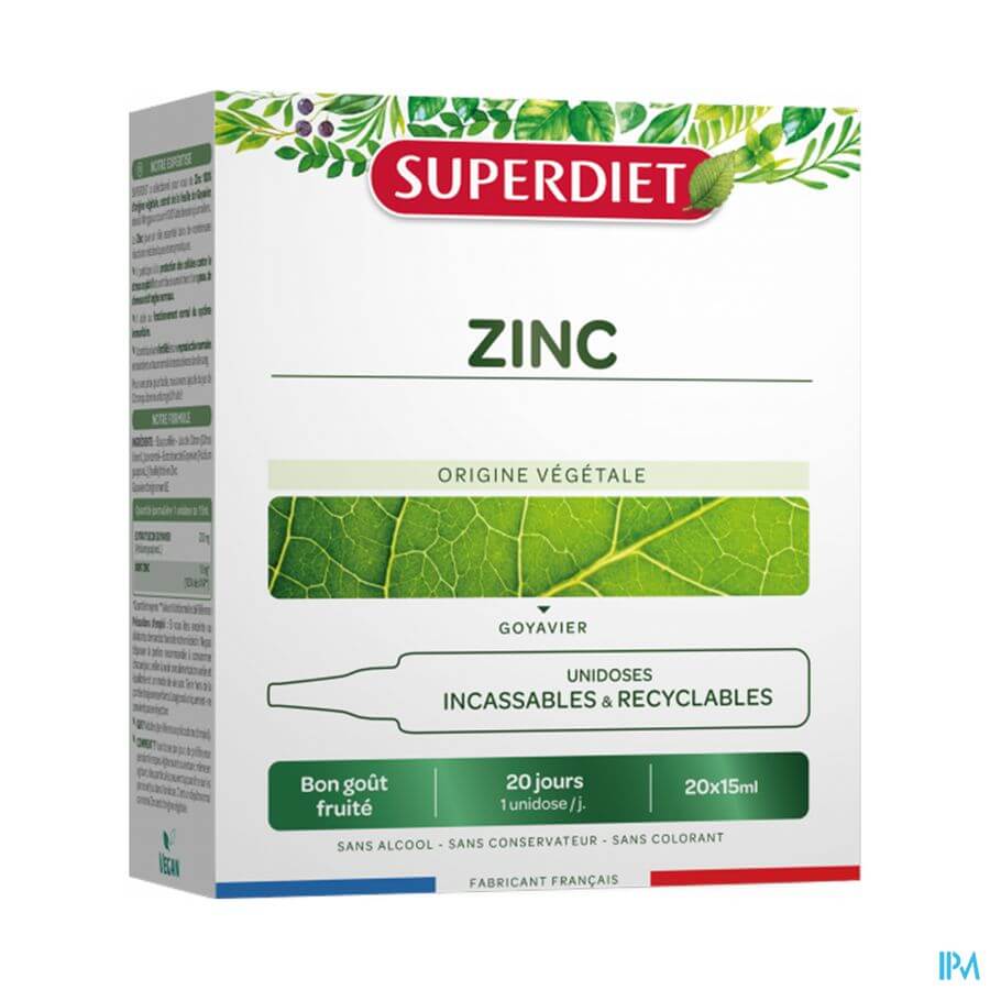 Superdiet Unidose Zinc 20x15ml est un complément alimentaire disponible en pharmacie. Il ne peut se substituer à un mode de vie sain et à une alimentation variée et équilibrée. Ne prenez pas plus que la dose quotidienne recommandée indiquée sur l'emballage. Demandez conseil à votre pharmacien. Tenir hors de portée des enfants.